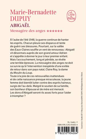 À l’aube de l’été 1948, la guerre continue de hanter les esprits. Chacun pleure ses disparus et tente de guérir ses blessures. Pourtant, sur la vallée des Eaux-Claires souffle un vent de renouveau : Abigaël vit désormais auprès de son grand amour Adrien et s’apprête à donner le jour à leur premier enfant. Mais l’accouchement, long et pénible, se révèle une terrible épreuve. La messagère des anges ne doit sa survie qu’à l'intervention inespérée d'une exilée de retour dans son pays natal, Claire Roy, la dame du Moulin du Loup.