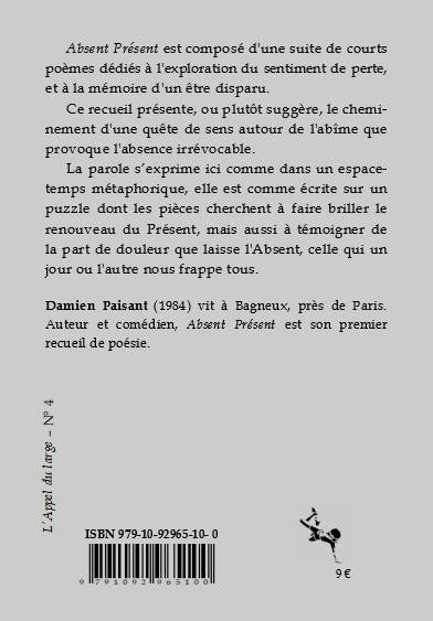 Absent Présent est composé d'une suite de courts poèmes dédiés à l'exploration du sentiment de perte, et à la mémoire d'un être disparu. Ce recueil présente, ou plutôt suggère, le chemi-nement d'une quête de sens autour de l'abîme que provoque l'absence irrévocable. La parole s’exprime ici comme dans un espace-temps métaphorique, elle est comme écrite sur un puzzle dont les pièces cherchent à faire briller le renouveau du Présent, mais aussi à témoigner de la part de douleur que laisse l'Absent, celle qui un jour ou l'autre nous frappe tous.
