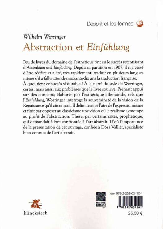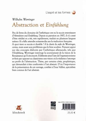 Peu de livres du domaine de l'esthetique ont eu le succes retentissant d'Abstraktion und Einfuhlung. Depuis sa parution en 1907, il n'a cesse d'etre reedite et a ete, tres rapidement, traduit en plusieurs langues meme s'il a fallu attendre soixante-dix ans la traduction francaise. A quoi tient ce succes si durable ? A la clarte du style de Worringer, certes, mais aussi aux problemes que le livre souleve. Prenant appui sur des concepts elabores par l'esthetique allemande, tels que l'Einfuhlung, Worringer interroge la souverainete de la vision de la Renaissance qu'il circonscrit. Il delimite ainsi l'aire de l'expressionnisme et finit par opposer au classicisme une vision ou le realisme s'estompe au profit de l'abstraction. These, par certains cotes, prophetique, qui demandait a etre confrontee a l'art abstrait. D'ou l'importance de la presentation de cet ouvrage, confiee a Dora Vallier, specialiste bien connue de l'art abstrait.