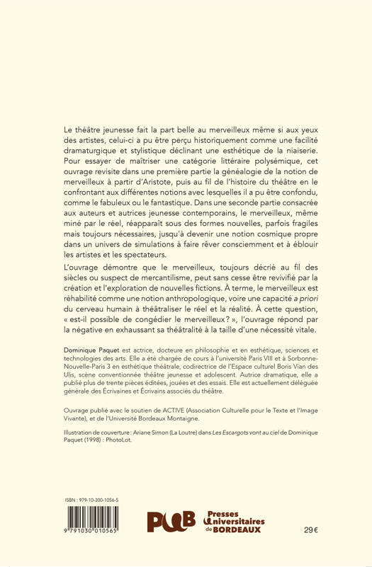 Le théâtre jeunesse fait la part belle au merveilleux même si aux yeux des artistes, celui-ci a pu être perçu historiquement comme une facilité dramaturgique et stylistique déclinant une esthétique de la niaiserie. Pour essayer de maîtriser une catégorie littéraire polysémique, cet ouvrage revisite dans une première partie la généalogie de la notion de merveilleux à partir d'Aristote, puis au fil de l'histoire du théâtre en le confrontant aux différentes notions avec lesquelles il a pu être confondu, comme le fabuleux ou le fantastique. Dans une seconde partie consacrée aux auteurs et autrices jeunesse contemporains, le merveilleux, même miné par le réel, réapparaît sous des formes nouvelles, parfois fragiles mais toujours nécessaires, jusqu'à devenir une notion cosmique propre dans un univers de simulations à faire rêver consciemment et à éblouir les artistes et les spectateurs.