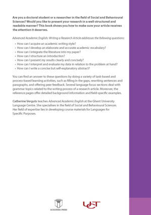 Are you a doctoral student or a researcher in the field of Natural Sciences? Would you like to present your research in a well-structured and readable manner? This book shows you how to make sure your article receives the attention it deserves. Advanced Academic English: Writing a Research Article addresses the following questions: How can I acquire an academic writing style? How can I develop an elaborate and accurate academic vocabulary? How can I integrate the literature into my paper? How can I structure an introduction? How can I present my results clearly and concisely? How can I interpret and evaluate my data in relation to the problem at hand? How can I write a concise but self-explanatory abstract? You can find an answer to these questions by doing a variety of task-based and process-based learning activities, such as filling in the gaps, rewriting sentences and paragraphs, and offering peer feedback. Several language focus sections deal with grammar topics related to the writing process of a research article. Moreover, the reference section offers detailed background information about relevant language and field-specific examples.