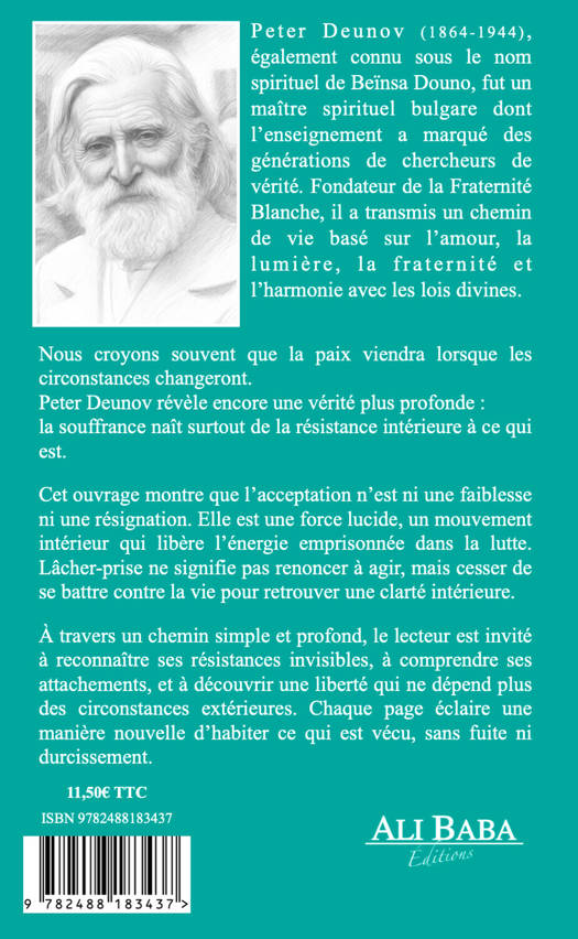 Nous croyons souvent que la paix viendra lorsque les circonstances changeront. Peter Deunov révèle encore une vérité plus profonde : la souffrance naît surtout de la résistance intérieure à ce qui est. Cet ouvrage montre que l’acceptation n’est ni une faiblesse ni une résignation. Elle est une force lucide, un mouvement intérieur qui libère l’énergie emprisonnée dans la lutte. Lâcher-prise ne signifie pas renoncer à agir, mais cesser de se battre contre la vie pour retrouver une clarté intérieure. À travers un chemin simple et profond, le lecteur est invité à reconnaître ses résistances invisibles, à comprendre ses attachements, et à découvrir une liberté qui ne dépend plus des circonstances extérieures. Chaque page éclaire une manière nouvelle d’habiter ce qui est vécu, sans fuite ni durcissement.