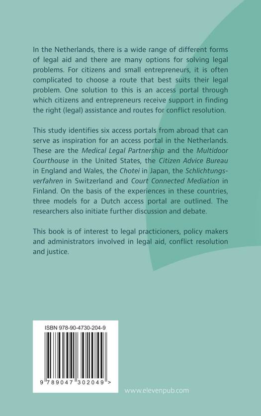 This study identifies six access portals from abroad that can serve as inspiration for an access portal in the Netherlands. These are the Medical Legal Partnership and the Multidoor Courthouse in the United States, the Citizen Advice Bureau in England and Wales, the Chotei in Japan, the Schlichtungsverfahren in Switzerland and Court Connected Mediation in Finland. On the basis of the experiences in these countries, three models for a Dutch access portal are outlined. The researchers also initiate further discussion and debate.