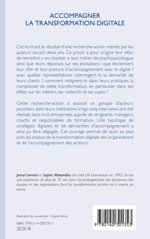 Cet écrit est le résultat d'une recherche-action menée par les auteurs durant deux ans. Ce projet a pour origine leur désir de remettre en chantier leur métier de psychosociologue ainsi que leurs réponses sur ses évolutions: que deviennent leur rôle et leur posture d'accompagnement avec le digital ? Avec quelles représentations interrogent-ils la demande de leurs clients ? Comment intègrent-ils dans leurs pratiques la complexité de cette transformation, en particulier dans ses effets sur les métiers, les collectifs et les sujets ? Cette recherche-action a associé un groupe d'acteurs pionniers dans leurs institutions. Vingt-cinq interviews ont été réalisées dans huit entreprises, auprès de dirigeants, managers, coachs et responsables de formation. Une typologie de stratégies digitales et de démarches d'accompagnement a ainsi pu être dégagée. Cet ouvrage permet de saisir au plus près les enjeux de la transformation digitale des organisations et de l'accompagnement des acteurs.