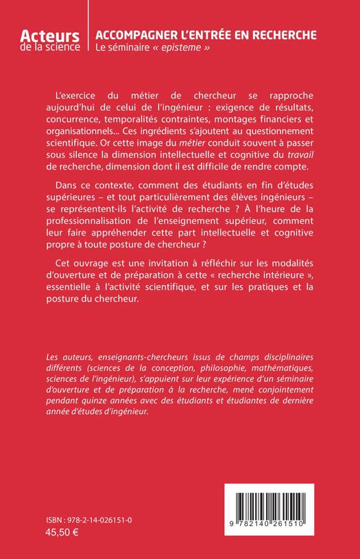 L’exercice du métier de chercheur se rapproche aujourd’hui de celui de l’ingénieur : exigence de résultats, concurrence, temporalités contraintes, montages financiers et organisationnels... Ces ingrédients s’ajoutent au questionnement scientifique. Or cette image du métier conduit souvent à passer sous silence la dimension intellectuelle et cognitive du travail de recherche, dimension dont il est difficile de rendre compte. Dans ce contexte, comment des étudiants en fin d’études supérieures – et tout particulièrement des élèves ingénieurs – se représentent-ils l’activité de recherche ? À l’heure de la professionnalisation de l’enseignement supérieur, comment leur faire appréhender cette part intellectuelle et cognitive propre à toute posture de chercheur ? Cet ouvrage est une invitation à réfléchir sur les modalités d’ouverture et de préparation à cette « recherche intérieure », essentielle à l’activité scientifique, et sur les pratiques et la posture du chercheur.