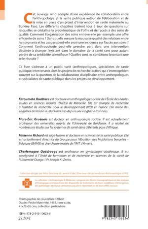 Cet ouvrage rend compte d'une expérience de collaboration entre l'anthropologie et la santé publique autour de l'élaboration et de la mise en place d'un projet d'intervention en santé maternelle au Burkina Faso. Les différents chapitres traitent tout à tour de questions sur lesquelles se cristallise la problématique de l'offre et de l'accès à des soins de qualité. Cette étude s'interroge sur la gestion de la collaboration disciplinaire entre anthropologues et spécialistes de santé publique.