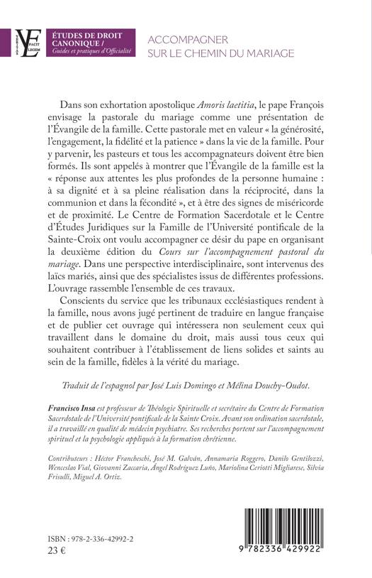 Dans son exhortation apostolique Amoris laetitia, le pape François envisage la pastorale du mariage comme une présentation de l'Évangile de la famille. Cette pastorale met en valeur « la générosité, l'engagement, la fidélité et la patience » dans la vie de la famille. Pour y parvenir, les pasteurs et tous les accompagnateurs doivent être bien formés. Ils sont appelés à montrer que l’Évangile de la famille est la « réponse aux attentes les plus profondes de la personne humaine : à sa dignité et à sa pleine réalisation dans la réciprocité, dans la communion et dans la fécondité », et à être des signes de miséricorde et de proximité. Le Centre de Formation Sacerdotale et le Centre d’Études Juridiques sur la Famille de l'Université pontificale de la Sainte-Croix ont voulu accompagner ce désir du pape en organisant la deuxième édition du Cours sur l'accompagnement pastoral du mariage. Dans une perspective interdisciplinaire, sont intervenus des laïcs mariés, ainsi que des spécialistes issus de différentes professions. L’ouvrage rassemble l’ensemble de ces travaux.
