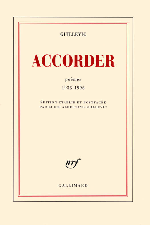 Accorder est en quelque sorte la suite de Relier, le précédent recueil de l'auteur, paru en 2007. Comme ce dernier, il reprend des textes publiés à tirage limité dans des livres d'artistes, la plupart confidentiels, souvent devenus introuvables. Ce n'est pas ici le Guillevic de Terraqué ni de Carnac, c'est un Guillevic en chantier, au jour le jour, répondant aux amis et aux revues qui le sollicitent. C'est plus de soixante ans du quotidien d'un poète attentif à demeurer à l'écoute des choses et des êtres, soixante ans de fidélité à la poésie. Où l'on peut suivre l'évolution de sa manière, des premiers pas encore trébuchants à la maturité plénière du poète, en passant par des poèmes en vers comptés classiques. Çà et là, de petites surprises déchirantes récompensent le lecteur, comme cette Étoile à Max Jacob oubliée dans le livre. Lucie Albertini-Guillevic accompagne ces textes de son commentaire et de ses notes, comme elle a accompagné le poète de son vivant.