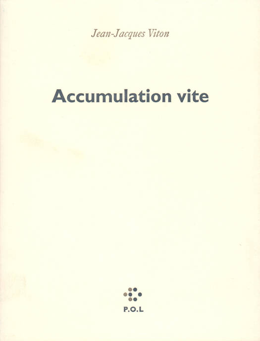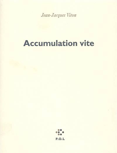 L'accumulation conduit à l'entassement, au stock. Ce livre est un dépôt de visages, de fragments de corps et de situations, de gestes et de bruits. L'accumulateur ramasse et rassemble ces parcelles, ces épisodes, pour les restituer sous forme de courants, de lancées, de passerelles - de poèmes. Cet assemblage va constituer un bloc qui est sans doute de protection. L'accumulation consolide en apparence le corps et ce qu'il contient : du réel et de la fiction ; elle l'alimente pour ce qu'il rejette : des mots, beaucoup de mots qui s'accumulent aussi pour enfouir encore. Tout cela, vite. Dans une manière de reportages et de repérages hachés, faits de sursauts alternatifs. L'accumulation vise enfin à la mise en place d'un rempart de coordination dont le pantoum à boucles est le chemin de ronde.
