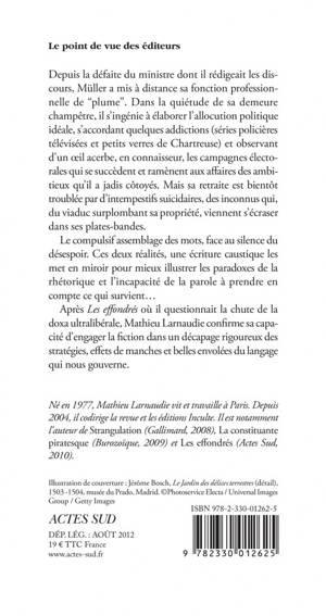Depuis la défaite du ministre dont il rédigeait les discours, Müller a mis à distance sa fonction professionnelle de "plume". Dans la quiétude de sa demeure champêtre, il s'ingénie à élaborer l'allocution politique idéale, s'accordant quelques addictions (séries policières télévisées et petits verres de Chartreuse) et observant d'un oeil acerbe, en connaisseur, les campagnes électorales qui se succèdent et ramènent aux affaires des ambitieux qu'il a jadis côtoyés. Mais sa retraite est bientôt troublée par d'intempestifs suicidaires, des inconnus qui, du viaduc surplombant sa propriété, viennent s'écraser dans ses plates-bandes. Le compulsif assemblage des mots, face au silence du désespoir. Ces deux réalités, une écriture caustique les met en miroir pour mieux illustrer les paradoxes de la rhétorique et l'incapacité de la parole à prendre en compte ce qui survient... Après «Les effondrés» où il questionnait la chute de la doxa ultralibérale, Mathieu Larnaudie confirme sa capacité d'engager la fiction dans un décapage rigoureux des stratégies, effets de manches et belles envolées du langage qui nous gouverne.
