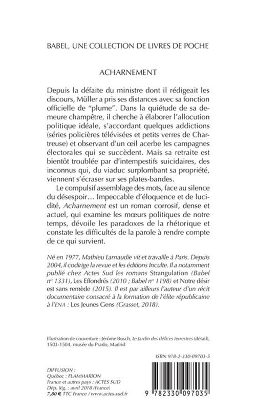 Le compulsif assemblage des mots, face au silence du désespoir... Impeccable d'éloquence et de lucidité, «Acharnement »est un roman co rrosif, dense et actuel, qui examine les moeurs politiques de notre temps, dévoile les paradoxes de la rhétorique et constate les difficultés de la parole à rendre compte de ce qui survient.