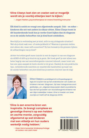 Achter het etiket geeft meer inzicht in wat de impact is van een diagnose als ADHD of ASS op je kind én op je gezin. Het boek geeft je niet alleen een beter begrip van wat neurodivergentie concreet inhoudt, maar toont ook hoe een open aanpak de beste sleutel is tot groei. Dankzij de vele praktische tips, verhelderende inzichten en waardevolle handvatten op maat van de unieke behoeften van jouw kind kun je meteen concreet aan de slag!