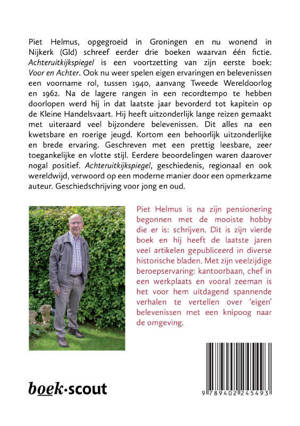 Piet Helmus, opgegroeid in Groningen en nu wonend in Nijkerk (Gld) schreef eerder drie boeken waarvan één fictie.Achteruitkijkspiegel is een voortzetting van zijn eerste boek: Voor en Achter. Ook nu weer spelen eigen ervaringen en belevenissen een voorname rol, tussen 1940, aanvang Tweede Wereldoorlog en 1962. Na de lagere rangen in een recordtempo te hebben doorlopen werd hij in dat laatste jaar bevorderd tot kapitein op de Kleine Handelsvaart. Hij heeft uitzonderlijk lange reizen gemaakt met uiteraard veel bijzondere belevenissen. Dit alles na een kwetsbare en roerige jeugd. Kortom een behoorlijk uitzonderlijke en brede ervaring. Geschreven met een prettig leesbare, zeer toegankelijke en vlotte stijl. Eerdere beoordelingen waren daarover nogal positief. Achteruitkijkspiegel, geschiedenis, regionaal en ook wereldwijd, verwoord op een moderne manier door een opmerkzame auteur. Geschiedschrijving voor jong en oud.