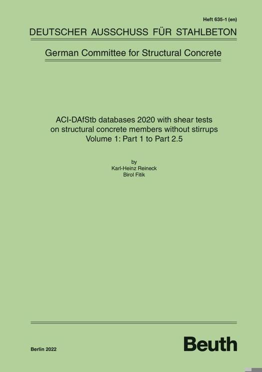This report is a follow-up of the Report DAfStb-Heft 617 so that the aims of this report remain the same as explained there in Chapter 1 of the foreword. The development of the ACI-DAfStb Shear Databases is described in Chapter 2 of the foreword of DAfStb-Heft 617 and is also not repeated here. The report is subdivided into seven parts, whereby within each part contains several subparts. Thereby, this DAfStb-Heft 635 mainly deals with databases for tests on beams without stirrups. For tests on beams with stirrups, the databases presented in DAfStb-Heft 617 remain valid. In Part 1, all procedures and all criteria for the selection of tests are explained in detail. This Part is a revision of that in DAfStb-Heft 617. Apart from editorial changes and some corrections, especially the flexural check has been revised in order to account for compression reinforcement in the beams. Part 2 of this report covers different databases with shear tests on reinforced concrete beams without stirrups. These are either revisions of the databases in DAfStb-Heft 617 with more tests covered or new databases. Part 2.1 presents the revised database with beams subjected to point loads, and Part 2.2A deals with the revised database with beams subjected to a uniformly distributed load. Part 2.2B presents the merged database with all 946 selected tests on beams with point loads (892 tests) and 54 tests on beams with a distributed load. These are far more tests than in DAfStb-Heft 617 with 744 tests on beams with point loads and 40 tests on beams with distributed loads, altogether 784 tests. This Part 2.2B also contains the evaluations with comparisons of several design proposals with test results. Part 2.3 presents a revised databases in comparison to DAfStb-Heft 617, because the number of tests on beams subjected to axial tension could be considerably increased. The databases comprises tests on simple beams as well as tests on beams with moments at the end supports like at intermediate supports. Part 2.4 and Part 2.5 present new databases with shear tests on beams without shear reinforcement with shear failures at intermediate supports. For continuous slabs or beams without shear reinforcement failure can occur at intermediate supports, and it is commonly agreed that higher shear capacities can be expected than for simply supported beams, but so far no databases are available to prove this assumption. The tests were performed on simply supported beams with either one or two loaded cantilevers providing the wanted support moment. Part 2.4 presents the database vuct-RC-int with shear tests on beams subjected to point loads, and Part 2.5 presents the database vuct-RC-gl-int with shear tests subjected to distributed loads. Part 2.6 deals like Part 2.5 with shear tests on beams without shear reinforcement subjected to distributed loads with shear failures at intermediate supports, but the beams were additionally subjected to axial compression. The three Parts 2.6A, 2.6B and 2.6C present the results of a test program with two series of shear test on beams without shear reinforcement. In Part 2.6D the database for these tests is presented and a summary of test results given as well as conclusions. In the final Part 2.6E the shear transfer and shear capacity at intermediate supports of members without stirrups is explained by means of strut-and-tie models. Part 3 is presented in DAfStb-Heft 617 and is not repeated here. However, the database of shear tests on prestressed concrete beams without stirrups subjected to point loads has been editorially revised and is available as evaluation database vuct-PC-A 2020. Part 4 and Part 5 with the databases with shear tests on r.c.- and p.c.- concrete beams with vertical stirrups were presented in DAfStb-Heft 617 and are still valid. Part 6 covers the shear tests on non-slender reinforced concrete beams with slendernesses a/d < 2,40 and has been revised as compared to DAfStb-Heft 617, so that new databases are presented.