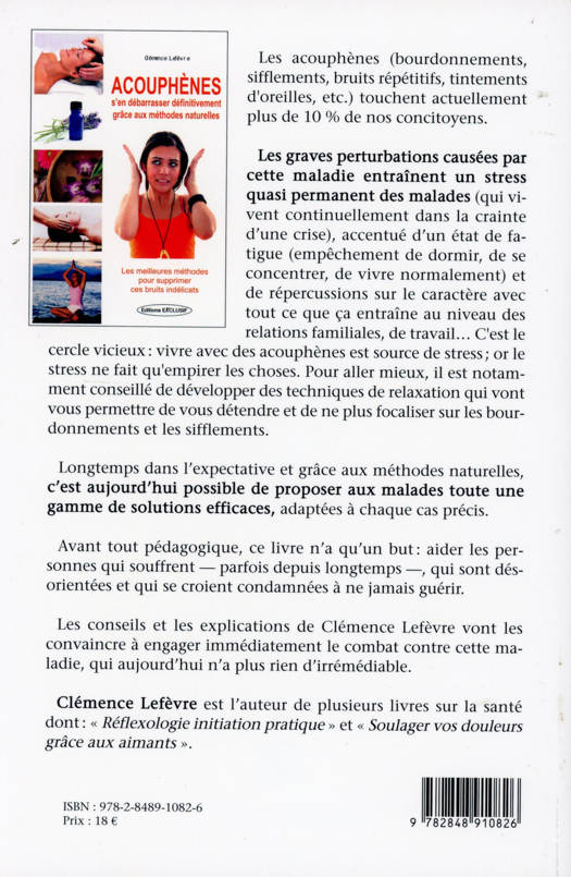 Les acouphènes (bourdonnements, sifflements, bruits répétitifs, tintements d'oreilles, etc.) touchent actuellement plus de 10 % de nos concitoyens. Les graves perturbations causées par cette maladie entraînent un stress quasi permanent des malades (qui vivent continuellement dans la crainte d'une crise), accentué d'un état de fatigue (empêchement de dormir, de se concentrer, de vivre normalement) et de répercussions sur le caractère avec tout ce que ça entraîne au niveau des relations familiales, de travail... C'est le cercle vicieux : vivre avec des acouphènes est source de stress ; or le stress ne fait qu'empirer les choses. Pour aller mieux, il est notamment conseillé de développer des techniques de relaxation qui vont vous permettre de vous détendre et de ne plus focaliser sur les bourdonnements et les sifflements. Longtemps dans l'expectative et grâce aux méthodes naturelles, c'est aujourd'hui possible de proposer aux malades toute une gamme de solutions efficaces, adaptées à chaque cas précis. Avant tout pédagogique, ce livre n'a qu'un but : aider les personnes qui souffrent - parfois depuis longtemps -, qui sont désorientées et qui se croient condamnées à ne jamais guérir. Les conseils et les explications de Clémence Lefèvre vont les convaincre à engager immédiatement le combat contre cette maladie, qui aujourd'hui n'a plus rien d'irrémédiable.
