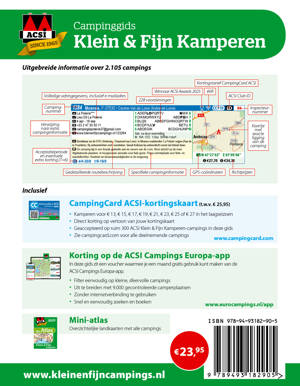Kampeert u het liefst op een kleinschalige en gemoedelijke camping? Wat verder weg van de drukte geniet u nog meer van de natuur en van de omgeving. En dat op een rustige plek en in een gemoedelijke sfeer. Maar waar vindt u dit soort kleine, fijne campings? Wij helpen u op weg en hebben de 1.950 leukste kleine, fijne campings in Europa voor u geselecteerd en verzameld in de ACSI Klein & Fijn Kamperen-gids.