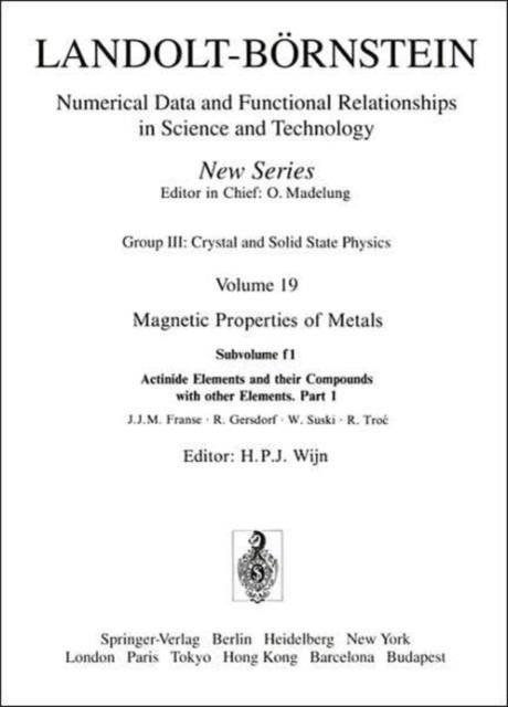 Volume 19 of Group III (Crystal and Solid State Physics) deals with the magnetic properties of metals, alloys and metallic compounds. The amount of information available in this field is so substantial that volume III/19 had to be split into several subvolumes. Subvolumes III/19a through III/19f treat the intrinsic magnetic properties, i.e. those properties which depend only on the chemical composition and the crystal structure. So far, subvolumes III/19a, III/19b, III/19c, III/19d2, III/19e1, and III/19e2 have appeared; III/19d1 will follow shortly. Subvolume III/19f covers the magnetic properties of actinide elements and their compounds. The present part 1 is concerned with the actinide elements and their compounds with 3d, 4d and 5d-elements. Part 2 (compounds with main group elements), which is due in the near future, also contains a comprehensive index of substances for volumes III/19a ... III/19f. Data on the properties that depend on the preparation of the samples measured, as for instance, thin films, amorphous alloys or the magnetic alloys used in technical applications, are compiled in the last subvolumes of III/19, viz. III/19g, III/19h and III/19i, of which III/19g and III/19h have already been published.