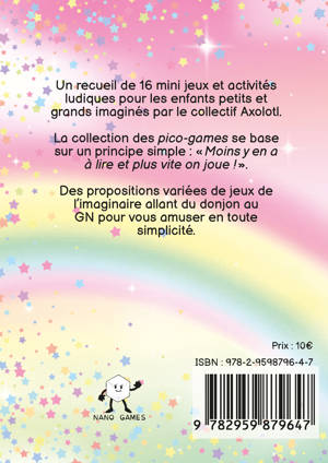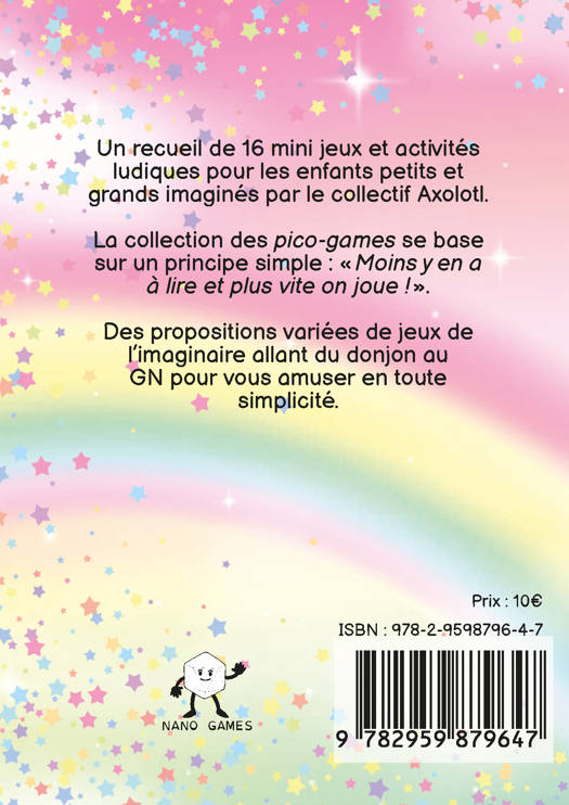 Un recueil de 16 mini jeux et activités ludiques pour les enfants petits et grands imaginés par le collectif Axolotl. La collection des pico-games se base sur un principe simple : « Moins y en a à lire et plus vite on joue ! ». Des propositions variées de jeux de l’imaginaire allant du donjon au GN pour vous amuser en toute simplicité.