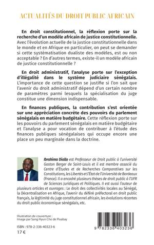 En droit constitutionnel, la réflexion porte sur la recherche d'un modèle africain de justice constitutionnelle. Avec l'évolution actuelle de la justice constitutionnelle dans le monde et en Afrique en particulier, on peut se demander si cette systématisation dualiste des modèles, est ou non acceptable ? En d'autres termes, existe-il un modèle africain de justice constitutionnelle ? En droit administratif, l'analyse porte sur l'exception d'illégalité dans le système judiciaire sénégalais. L'importance de cette question se justifie si l'on sait que l'avenir du droit administratif dépend d'un certain nombre de paramètres parmi lesquels la spécialisation du juge constitue une dimension indispensable. En finances publiques, la contribution s'est orientée sur une appréciation concrète des pouvoirs du parlement sénégalais en matière budgétaire. Cette réflexion porte sur les pouvoirs du parlement sénégalais en matière budgétaire et l'analyse a pour vocation de contribuer à l'étude des finances publiques sénégalaises qui occupe encore une place un peu marginale dans la doctrine.