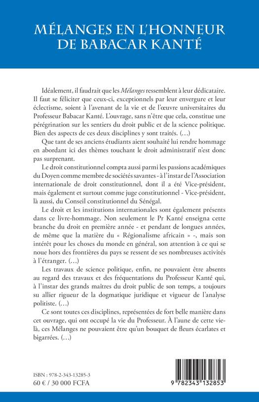 Ces Mélanges en l'honneur du doyen Babacar Kanté constituent une pérégrination sur les sentiers du droit public et de la science politique, sans oublier son rôle pour la préparation au concours d'agrégation du CAMES (ouvrage relié cartonné).