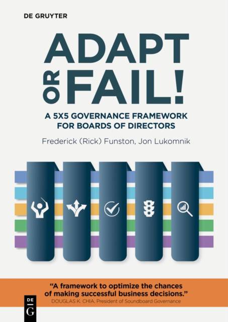 Conventional approaches to board governance have been unable to keep pace with the momentum of change, as well as the uncertainty and asymmetric competition that characterizes the 21st century. Adapt or Fail! A 5x5 Governance Framework for Boards of Directors provides practical ways boards can lead and accelerate adaptation, even in the face of extreme uncertainty and inevitable adversity. It pulls back the curtain on governance successes and failures. It highlights the critical questions every board should ask and the lessons worth learning if organizations are to successfully adapt.