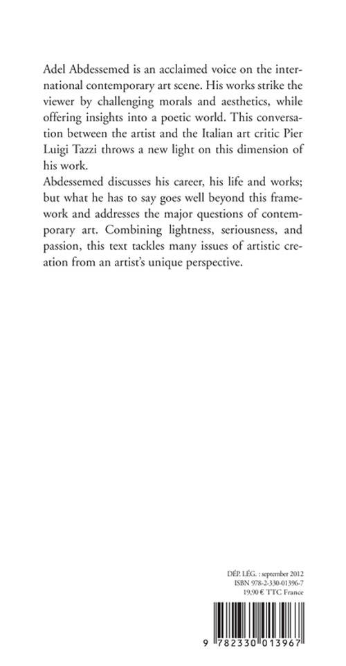 Adel Abdessemed (born 1971) has been a major figure in contemporary art since he entered the international creative world in the early 2000s. In 2012, after recent exhibitions in Nagoya, Venice, London, Tel Aviv, Berlin and New York, his work is featured in a large exhibition at the Centre Georges Pompidou. Well known for his ability to produce images generally considered violent, Abdessemed appeals to the viewer's immediate reactions. In conversation with Italian art critic Pier Luigi Tazzi, Abdessemed explains the personal and creative background to his work. As he retraces his artistic journey, its major phases and his major works, his remarks extend beyond the framework of art to address the fundamental issues of life itself. This text, filled with passion and humor, explores the perspective of a prominent contemporary artist, and deals with all aspects of artistic creation.