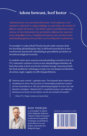 Ademen doen we meestal onbewust. Toch ademen veel mensen eigenlijk verkeerd: te oppervlakkig, te snel, door de mond of alleen vanuit de borst ... Dat leidt vaak tot problemen zoals stress, en het belemmert je prestaties tijdens het sporten en je dagelijks leven. Omgekeerd kun je met een bewuste, aangepaste ademhaling juist je focus, flow en (veer)kracht verbeteren. Voormalig F-16-piloot Rudi Thoelen leerde onder extreme druk hoe krachtig ademhaling kan zijn. In dit boek toont hij hoe je met een bewuste, functionele ademhaling je gezondheid, prestaties en stressbestendigheid versterkt. Je ontdekt onder meer waarom neusademhaling cruciaal is, hoe je je CO²-tolerantie verbetert en hoe je met ademhalingstechnieken als hartcoherentie je hart en je brein in balans brengt. Daarnaast biedt het boek praktische oefeningen en tips voor wie kampt met klachten als astma, angst, rugpijn en zelfs slaapproblemen.