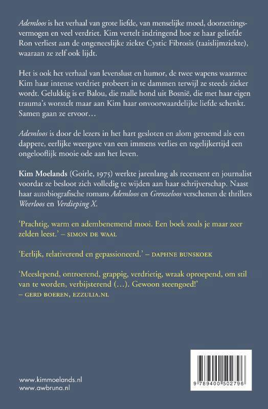 Ademloos is het verhaal van grote liefde, van menselijke moed, doorzettingsvermogen en veel verdriet. Kim vertelt indringend hoe ze haar geliefde Ron verliest aan de ongeneeslijke ziekte Cystic Fibrosis (taaislijmziekte), waaraan ze zelf ook lijdt.