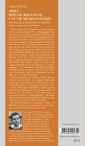 Interrompue par la disparition brutale d’Alain Prévost le 19 décembre 1971, sa bibliographie s’est enrichie d’un recueil de nouvelles publié six mois plus tard. Ces textes révèlent la géographie intime de l’auteur et forment un résumé de ses univers. Le lecteur voyage en région parisienne, dans une ferme beauceronne de grande culture, dans un village du pays de Caux ou bien encore dans un Vercors plus vrai que nature. Voilà pour le décor. Des personnages attachants, aux caractères trempés ou bien fragiles, essaient tout simplement de l’habiter et d’y vivre. C’est Champhol, mutilé de guerre, apprenti chasseur, incapable de tuer ; c’est une femme qui bovaryse entre son mari et ses enfants, distraite par un représentant en voyages organisés ; c’est l’instituteur anticlérical Michard bataillant contre sa bigote d’épouse; c’est Micarême, braconnier lancé à la poursuite d’un sanglier avec sa meute de chiens... Côté documents, les articles d’Alain Prévost reflètent ses rencontres : le sculpteur Calder, des marins sur un chalutier en mer du Nord, sa vision de Saint-Exupéry ou un dialogue avec des lecteurs. Enfin, divers aspects inédits de «Grenadou, paysan français» sont dévoilés par un entretien pour un manuel de conversation franco-américain, sa conception du livre «magnétophone», un reportage sur les femmes de la famille Grenadou ou une critique de l’ouvrage par Jean-Louis Bory. Cet écrivain aimant les animaux, la chasse, le billard et les chevaux a aussi passé sa vie à rencontrer les hommes, loin de sa tour d’ivoire.