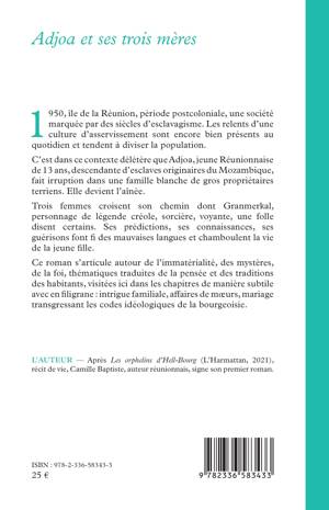 1950, île de la Réunion, période postcoloniale, une société marquée par des siècles d'esclavagisme. Les relents d'une culture d'asservissement sont encore bien présents au quotidien et tendent à diviser la population. C'est dans ce contexte délétère que Adjoa, jeune Réunionnaise de 13 ans, descendante d'esclaves originaires du Mozambique, fait irruption dans une famille blanche de gros propriétaires terriens. Elle devient l'aînée. Trois femmes croisent son chemin dont Granmerkal, personnage de légende créole, sorcière, voyante, une folle disent certains. Ses prédictions, ses connaissances, ses guérisons font fi des mauvaises langues et chamboulent la vie de la jeune fille. Ce roman s'articule autour de l'immatérialité, des mystères, de la foi, thématiques traduites de la pensée et des traditions des habitants, visitées ici dans les chapitres de manière subtile avec en filigrane: intrigue familiale, affaires de moeurs, mariage transgressant les codes idéologiques de la bourgeoisie.