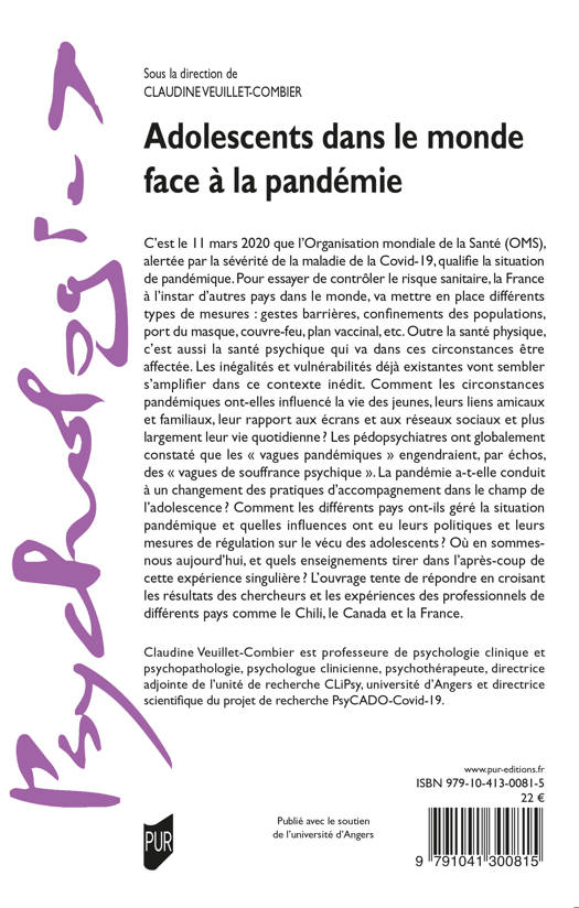 C’est le 11 mars 2020 que l’Organisation mondiale de la Santé (OMS), alertée par la sévérité de la maladie de la Covid-19, qualifie la situation de pandémique. Pour essayer de contrôler le risque sanitaire, la France à l’instar d’autres pays dans le monde, va mettre en place différents types de mesures : gestes barrières, confinements des populations, port du masque, couvre-feu, plan vaccinal, etc. Outre la santé physique, c’est aussi la santé psychique qui va dans ces circonstances être affectée. Les inégalités et vulnérabilités déjà existantes vont sembler s’amplifier dans ce contexte inédit. Comment les circonstances pandémiques ont-elles influencé la vie des jeunes, leurs liens amicaux et familiaux, leur rapport aux écrans et aux réseaux sociaux et plus largement leur vie quotidienne ? Les pédopsychiatres ont globalement constaté que les « vagues pandémiques » engendraient, par échos, des « vagues de souffrance psychique ». La pandémie a-t-elle conduit à un changement des pratiques d’accompagnement dans le champ de l’adolescence ? Comment les différents pays ont-ils géré la situation pandémique et quelles influences ont eu leurs politiques et leurs mesures de régulation sur le vécu des adolescents ? Où en sommes-nous aujourd’hui, et quels enseignements tirer dans l’après-coup de cette expérience singulière ? L’ouvrage tente de répondre en croisant les résultats des chercheurs et les expériences des professionnels de différents pays comme le Chili, le Canada et la France.