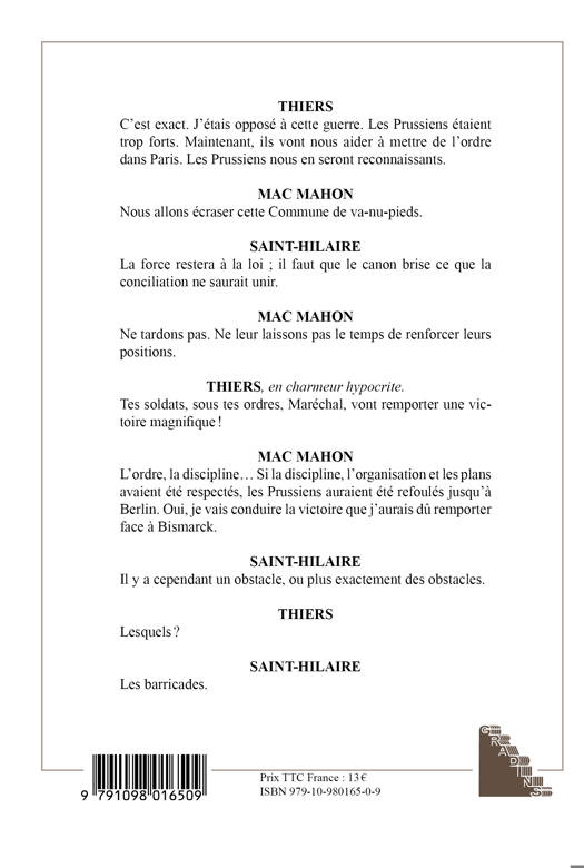 Du théâtre burlesque, à la fois tragique et comique. Adolphe Thiers est un personnage cynique, cruel mais aussi ridicule, une sorte d’Ubu roi avant la lettre. Non content d’avoir tous les pouvoirs et de les exercer avec tyranie, Adolphe Thiers veut aussi devenir roi. Du dimanche 21 au dimanche 28 mai 1871, la Semaine sanglante marque les événements les plus tragiques et les plus meurtriers de la guerre civile de 1871. Installé à la préfecture de Versailles, Adolphe affiche sa volonté d’écraser définitivement la Commune. Tout est bon pour broyer les « scélérats » : manipulation du dévoué Maréchal Mac Mahon, missions de la police secrète, envoi d’espions, infiltration de partisans versaillais, soudoiement des dirigeants de la Commune... Une femme, Thérèse, lui demande d’épargner sa fille, Alice. Pendant ce temps, à Paris, dans un atelier de typographie, Arthur et sa fiancée Louise pensent à leur futur bonheur.