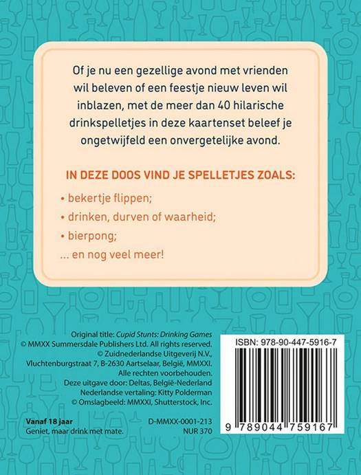 Of je nu een gezellige avond met vrienden wil beleven of een feestje nieuw leven wil inblazen, met de meer dan 40 hilarische drinkspelletjes in deze kaartenset beleef je ongetwijfeld een onvergetelijke avond. In deze doos vind je spelletjes zoals: - bekertje flippen; - drinken, durven of waarheid; - bierpong; … en nog veel meer!