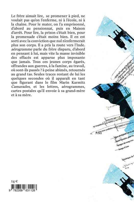 aérogramme, a été écrit pour le frère disparu,d’abord en pensant à lui, mais vite la masse invisible des effacés est apparue plus imposante que jamais. Tous ces jeunes corps égarés, offrandes aux guerres, à la famine, au travail, où sont-ils passés ? à peine abimés, retournés au grand tas. Le frère fait partie de ce grand tas de corps-là. Né juste après la deuxième guerre mondiale, à une période où l’Europe a beaucoup procréé. Avec la guerre, tant de disparus, il fallait des corps neufs de garçons pour relancer la production et des corps neufs de filles pour la reproduction. Des corps pour aller travailler à l’usine, ou ailleurs, des corps ponctuels et obéissants. Cependant de tout temps il y eut des réfractaires, le frère fut l’un d’entre eux. <br /> Il aimait lire et se promener à pied, ne voulait pas qu’on l’enferme, ni à l’école, ni à la chaîne. Pour le mater, on l’a emprisonné, d’abord au pensionnat, puis en Maison d’arrêt. Pour lire, la prison c’était bien, pour la promenade c’était moins bien. Il en est sorti avec la conviction que nul n’enfermerait plus son corps. Il a pris la route vers l’Inde, la terre où les dieux sont aussi nombreux que les parias et pas plus sacrés que les vaches. Le pays où l’on peut renaitre plein de fois, dans plein d’autres corps, quand celui qu’on habite est usé. A vingt-cinq ans le sien était déjà très abîmé par la prison et la drogue. Mais son errance fut un mouvement joyeux que retranscrivent les aérogrammes écrits à chaque halte. D’autres que lui sans cesse disparaissent, engloutis sans avoir eu le temps de poster une lettre. Mais leurs pas, comme ceux de mon frère, sont une écriture. La première de toutes les écritures.Parallèlement, on suit les différentes scènes de Camarades, film de Marin Karmitz a tourné en 1969 à Saint-Nazaire, ville ouvrière détruite pendant la guerre, reconstruite juste après, décor parfait pour ce film militant, dans lequel le frère fut figurant. Durant 32 secondes, le frère réapparaît, mais plus Frédérique Guétat-Liviani a regardé cet extrait plus l’image de son frère est devenue obscure. Elle a pensé alors qu’il lui fallait réécrire le film, ailleurs et autrement. Écrire un film qui ne se projette pas.