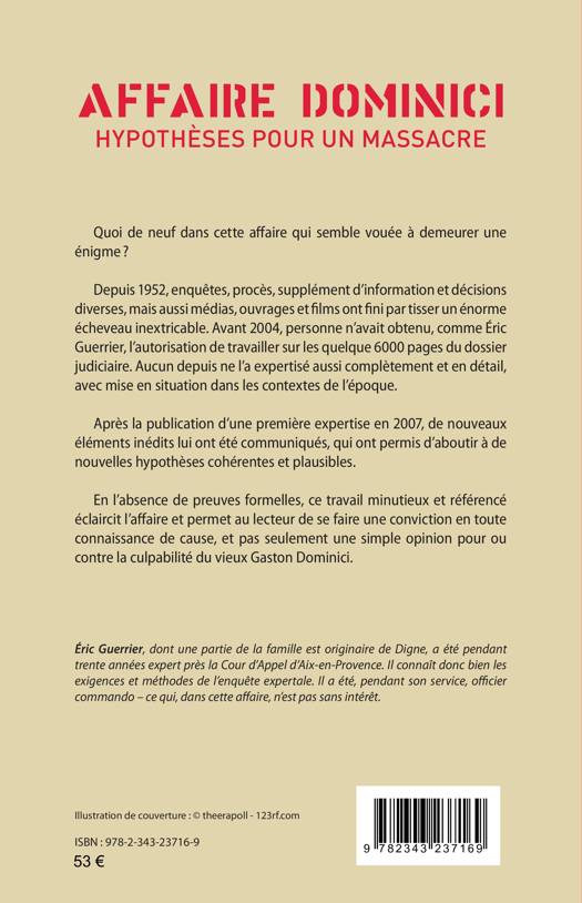 Quoi de neuf dans cette affaire qui semble vouée à demeurer une énigme ? Depuis 1952, enquêtes, procès, supplément d’information et décisions diverses, mais aussi médias, ouvrages et films ont fini par tisser un énorme écheveau inextricable. Avant 2004, personne n’avait obtenu, comme Éric Guerrier, l’autorisation de travailler sur les quelque 6000 pages du dossier judiciaire. Aucun depuis ne l’a expertisé aussi complètement et en détail, avec mise en situation dans les contextes de l’époque. Après la publication d’une première expertise en 2007, de nouveaux éléments inédits lui ont été communiqués, qui ont permis d’aboutir à de nouvelles hypothèses cohérentes et plausibles. En l’absence de preuves formelles, ce travail minutieux et référencé éclaircit l’affaire et permet au lecteur de se faire une conviction en toute connaissance de cause, et pas seulement une simple opinion pour ou contre la culpabilité du vieux Gaston Dominici.