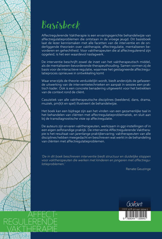 Casuïstiek van a lle vaktherapeutische disciplines (beeldend, dans, drama, muziek, pm(k)t en spel) illustreert de behandelwijze. Het boek kan een bijdrage zijn aan het vinden van een gezamenlijke taal in het behandelen van cliënten met affectregulatieproblematiek, en sluit aan bij de transdiagnostische visie op affectregulatie.