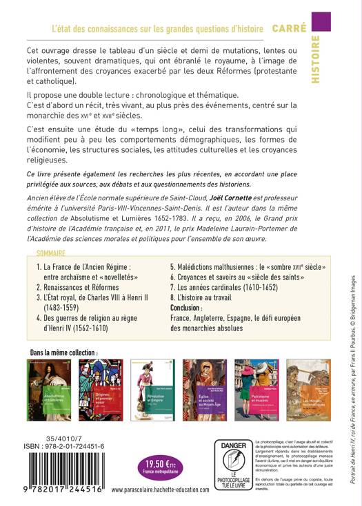 Ce livre présente également les recherches les plus récentes, en accordant une place privilégiée aux sources, aux débats et aux questionnements des historiens. Ancien élève de l’École normale supérieure de Saint-Cloud, Joël Cornette est professeur émérite à l’université Paris-VIII-Vincennes-Saint-Denis. Il est l’auteur dans la même collection de Absolutisme et Lumières 1652-1783. Il a reçu, en 2006, le Grand prix d’histoire de l’Académie française et, en 2011, le prix Madeleine Laurain-Portemer de l’Académie des sciences morales et politiques pour l’ensemble de son œuvre.