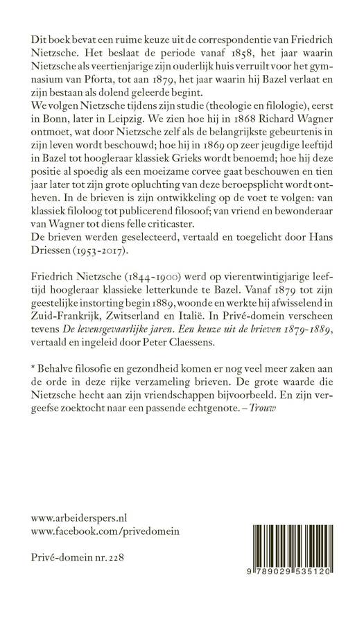 Dit boek bevat een ruime keuze uit de correspondentie van Friedrich Nietzsche. Het beslaat de periode vanaf 1858, het jaar waarin Nietzsche als veertienjarige zijn ouderlijk huis verruilt voor het gymnasium van Pforta, tot aan 1879, het jaar waarin hij Bazel verlaat en zijn bestaan als dolend geleerde begint.