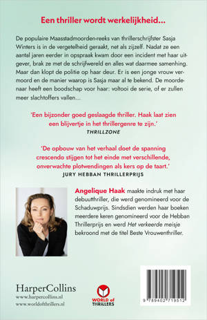Afgeschreven van Angelique Haak is psychologische spanning van topniveau, genomineerd voor de Hebban Thrillerprijs. De populaire Maasstadmoorden-reeks van thrillerschrijfster Sasja Winters is in de vergetelheid geraakt, net als zijzelf. Nadat ze een aantal jaren eerder in opspraak kwam door een incident met haar uitgever, brak ze met de schrijfwereld en alles wat daarmee samenhing. Maar dan klopt de politie op haar deur. Er is een jonge vrouw vermoord en de manier waarop is Sasja maar al te bekend. De moordenaar heeft een boodschap voor haar: voltooi de serie, of er zullen meer slachtoffers vallen… 'Een bijzonder goed geslaagde thriller. Haak laat zien een blijvertje in het thrillergenre te zijn.' Thrillzone 'De opbouw van het verhaal doet de spanning crescendo stijgen tot het einde met verschillende, onverwachte plotwendingen als kers op de taart.' Jury Hebban Thrillerprijs