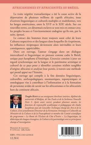 La traite négrière transatlantique a été la cause active de la déportation de plusieurs millions de captifs africains, issus d'univers linguistiques et culturels multiples et multiformes, vers les berges américaines, entre le XVIe et le XIXe siècle. Dans cet ouvrage, l'auteur s'engage dans un dialogue interculturel et linguistique en prenant comme cadre le Brésil, unique pays lusophone d'Amérique. L'exercice consiste à jeter un regard synchronique sur la langue et le patrimoine artistique et culturel de ce pays pour y identifier certaines réalités tangibles d'origine africaine et analyser leur portée, à travers une méthode qui prend appui sur l'histoire.