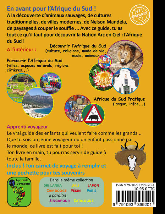 En avant pour l’Afrique du Sud !<br /> À la découverte d’animaux sauvages, de cultures traditionnelles, de villes modernes, de Nelson Mandela, de paysages à couper le souffle... Avec ce guide, tu as tout ce qu’il faut pour découvrir la Nation Arc en Ciel : l’Afrique du Sud !<br /> Contenu : Une section pour découvrir le pays : géographie, histoire, parcs et animaux, habitudes et mode de vie... Une section de visite du pays par thème : villes, côtes océaniques, espaces naturels. Une section pratique : langue, infos pratiques, conseils...<br /> Les petits plus : une mise en page attractive (colorée, textes courts, nombreuses photos et illustrations), une section pour décrire ses expériences de voyage, une pochette pour conserver ses souvenirs.