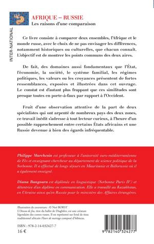 Ce livre consiste à comparer deux ensembles, l'Afrique et le monde russe, avec le choix de ne pas envisager les différences, notamment historiques ou culturelles, que chacun connaît. L'objectif est de montrer les points communs des deux aires. De fait, des domaines aussi fondamentaux que l'État, l'économie, la société, le système familial, les régimes politiques, les valeurs ou les croyances présentent de fortes ressemblances, exposées et illustrées dans cet ouvrage. Le constat est d'autant plus frappant que ces similitudes sont presque toutes en porte-à-faux par rapport à l'Occident. Fruit d'une observation attentive de la part de deux spécialistes qui ont arpenté de nombreux pays des deux zones, ce travail inédit s'adresse à tout lecteur curieux, à l'heure d'un possible rapprochement entre certains États africains et une Russie devenue à bien des égards infréquentable.