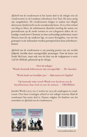 De jaren zestig zijn aangebroken. De vroedvrouwen krijgen te maken met illegale abortussen, kindersterfte en een veranderende buurt. Zo is er het verhaal van Megan en Mave, de identieke tweeling die samen een groentekraam op de markt hebben en een brute echtgenoot delen; van de onhandige vroedvrouw Chummy en haar even onhandige politieman; van zuster Monica Joan die op ramkoers ligt, en van zuster Evangelina bij wie je je afvraagt of er ooit nog een glimlach om haar mond zal verschijnen. Afscheid van de vroedvrouwen is een prachtig portret van een voorbij tijdperk. Een tijdperk vol kameraadschap, bevolkt door onvergetelijke personages. Voor de lezers van Frank McCourt, maar ook voor de fans van Call the Midwife, de veelgeprezen dvdserie gebaseerd op de trilogie. Een weemoedig afscheid van een gedenkwaardige trilogie. Daily Express Een betere beschrijving van een lang vervlogen tijdperk en de bijbehorende hartverwarmende normen en waarden is onmogelijk. Schitterend. Sunday Business Post