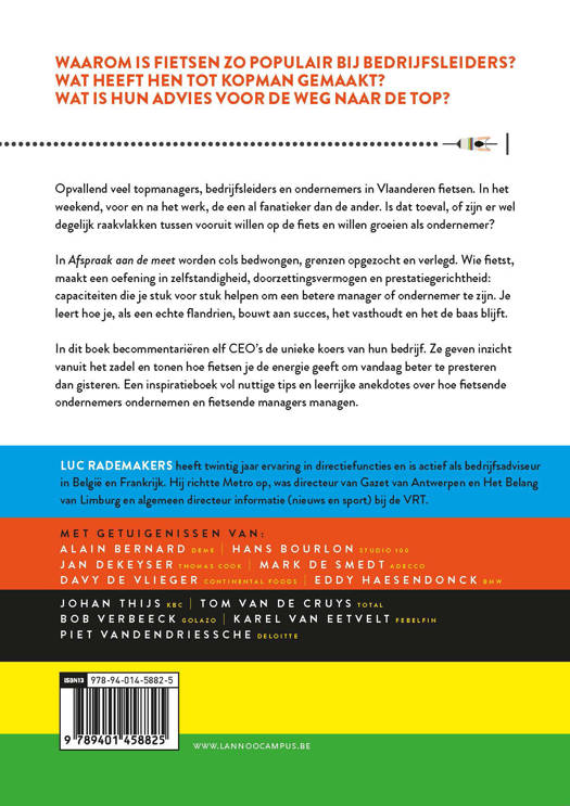 In Afspraak aan de meet worden cols bedwongen, grenzen opgezocht en verlegd. Wie fietst, maakt een oefening in zelfstandigheid, doorzettingsvermogen en prestatiegerichtheid: capaciteiten die je stuk voor stuk helpen om een betere manager of ondernemer te zijn. Je leert hoe je, als een echte flandrien, bouwt aan succes, het vasthoudt en het de baas blijft.