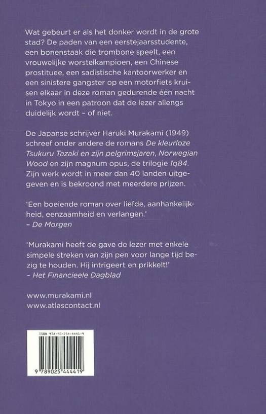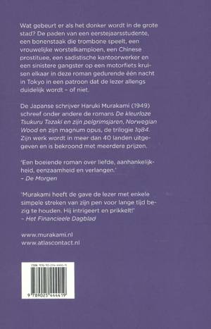 In 'After Dark' van Haruki Murakami wordt de vraag gesteld wat er gebeurt als het donker wordt in de grote stad. De paden van een eerstejaarsstudente, een bonenstaak die trombone speelt, een vrouwelijke worstelkampioen, een Chinese prostituee, een sadistische kantoorwerker en een sinistere gangster op een motorfiets kruisen elkaar gedurende één nacht in Tokyo in een patroon dat de lezer allengs duidelijk wordt – of niet.