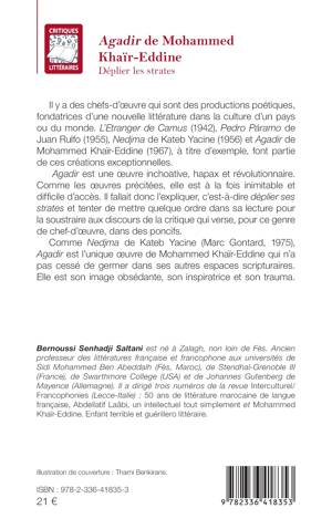 Il y a des chefs-d'oeuvre qui sont des productions poétiques, fondatrices d'une nouvelle littérature dans la culture d'un pays ou du monde. L'Etranger de Camus (1942), Pedro Páramo de Juan Rulfo (1955), Nedjma de Kateb Yacine (1956) et Agadir de Mohammed Khaïr-Eddine (1967), à titre d'exemple, font partie de ces créations exceptionnelles. Agadir est une oeuvre inchoative, hapax et révolutionnaire. Comme les oeuvres précitées, elle est à la fois inimitable et difficile d'accès. Il fallait donc l'expliquer, c'est-à-dire déplier ses strates et tenter de mettre quelque ordre dans sa lecture pour la soustraire aux discours de la critique qui verse, pour ce genre de chef-d'oeuvre, dans des poncifs. Comme Nedjma de Kateb Yacine (Marc Gontard, 1975), Agadir est l'unique oeuvre de Mohammed Khaïr-Eddine qui n'a pas cessé de germer dans ses autres espaces scripturaires. Elle est son image obsédante, son inspiratrice et son trauma.