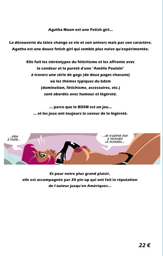 Agatha Moon est une Fetish girl... La découverte du latex change sa vie et son univers mais pas son caractère. Agatha est une douce fetish girl qui semble plus naïve qu'expérimentée. Elle fuit les stéréotypes du fétichisme et les affronte avec la candeur et la pureté d'une "Amélie Poulain" à travers une série de gags (de deux pages chacune) où les thèmes typiques du bdsm (domination, fétichisme.
