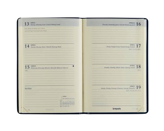 Brepols agenda Delta Seta 6-talig boekgebonden met 1 week op 2 pagina's op chamois papier met scheurhoekjes in een soepele kunstlederen omslag op formaat 8,1 x 12 cm.