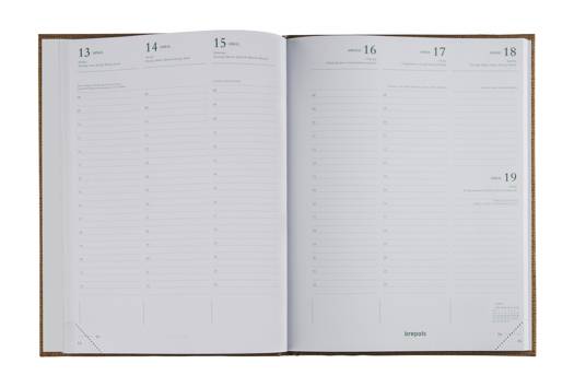 Brepols agenda Ecotiming Kazar 6-talig met 1 week op 2 pagina's en uurindeling (8:00u-22:00u). Boekgebonden met wit eco papier, leeslint en scheurhoekjes in een stevige papieren omslag op formaat 17,1 x 22 cm.