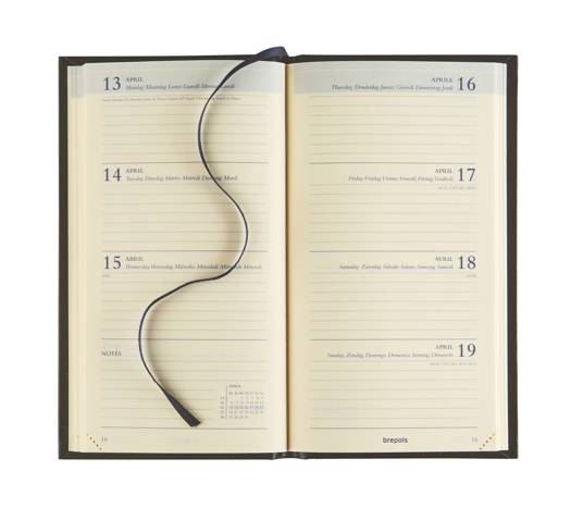 Brepols agenda Interplan Colora 6-talig boekgebonden met 1 week op 2 pagina's op chamois papier met scheurhoekjes en leeslint in een soepele kunstlederen omslag op formaat 9 x 16 cm.
